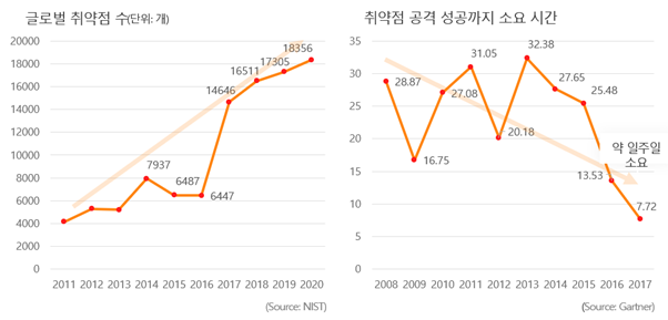 하지만 해커들 또한 이러한 환경의 변화에 맞춰서 Zero day 공격 등 취약점 위주의 해킹 시도를 많이 하고 있습니다. 최근의 해킹 트랜드를 보면 취약점을 이용한 공격은 증가하되 공격 성공 시간은 많이 단축된 것을 확인할 수가 있습니다. 즉 공격 성공 확률이 크게 상승할 수 있다는 것입니다.