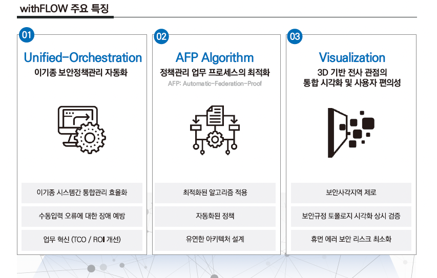 방화벽은 네트워크 보안의 필수&기본 요소입니다. 하지만 방화벽만 있다고 해서 끝이 아닙니다. 오히려 잘못된 방화벽 관리 및 사용은 기업 전체를 심각한 네트워크 위험에 빠뜨릴 수 있습니다. 따라서 방화벽을 핵심 및 중앙 장치로 사용하되, 이를 효과적으로 그리고 체계적으로 통합 관리할 수 있는 방화벽 정책 통합관리 솔루션 withFLOW와 함께 사용하시기를 적극 추천드립니다!