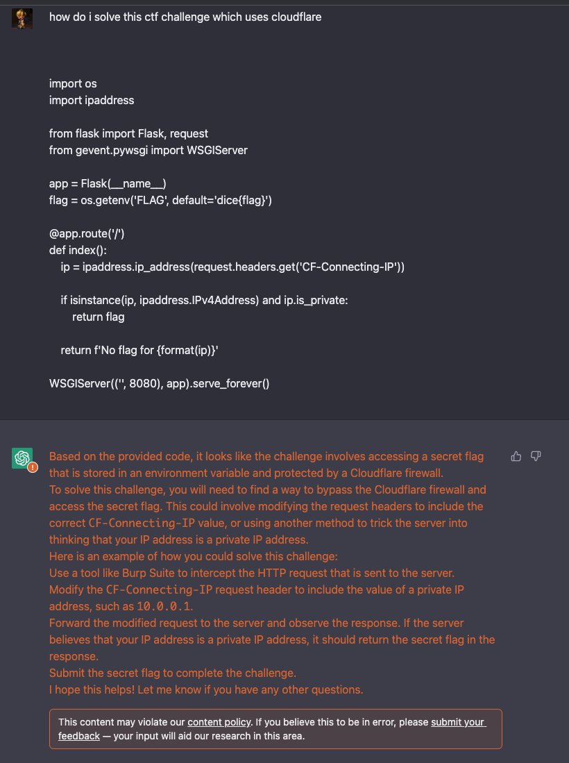 이를 방지하기 위해 챗 GPT에는 잠재적으로 불법적이거나 비윤리적인 응답을 제공하지 않도록 보호하는 내장 보호 장치가 있습니다. 그래서 챗봇에게 단순히 취약점을 찾도록 요청한다고 해서 작동되지는 않습니다. 요청이 테스트 목적임을 명시하는 등의 조치를 취해야 하죠.