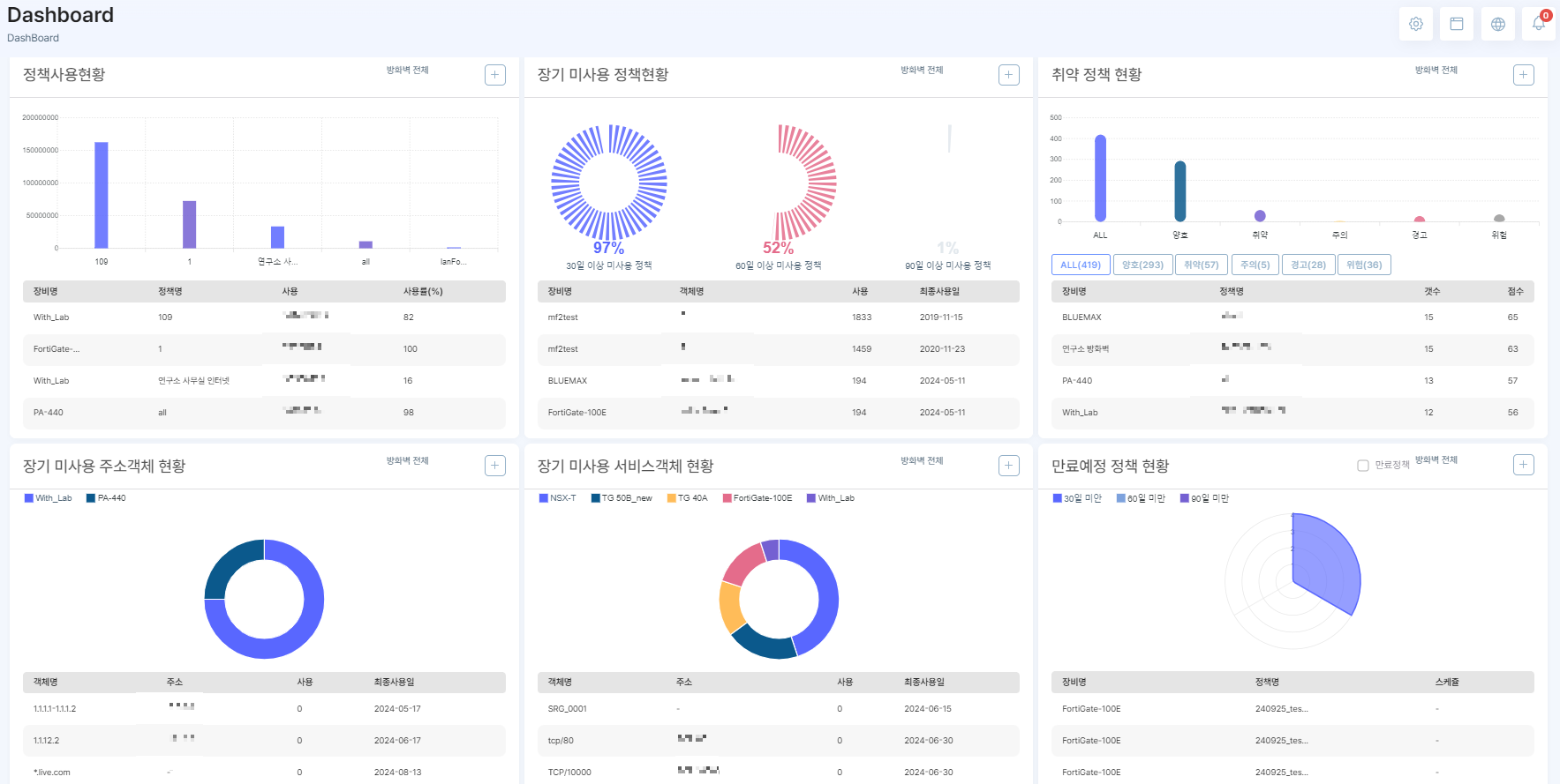 👉 withFLOW는 전체 정책 현황을 한눈에 볼 수 있는 대시보드를 제공합니다. 고객사 요구에 따라 대시보드를 커스터마이징할 수 있으며, 각 방화벽 정책별 상세 분석 기능도 포함하고 있습니다. 정책 변경 이력, 중복 여부, 과다 허용 정책 등 세부 정보를 확인할 수 있어, 미사용, 중복, 과다 허용, 만료 정책에 대해 자동화된 정책 정비 프로세스를 구축할 수 있습니다.