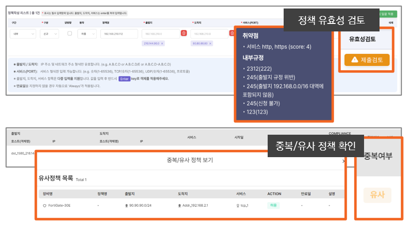 👉 withFLOW는 방화벽 정책 설계 단계에서부터 정책의 유효성 및 중복/유사 정책의 여부를 확인할 수 있습니다. 그래서 중복 정책 자체를 원천 차단할 수 있습니다.