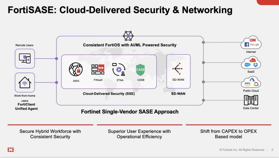 특히 Fortinet의 FortiSASE는 보안 웹 게이트웨이(SWG), 제로 트러스트 네트워크 액세스(ZTNA), 차세대 CASB 등 다양한 기능을 통합해 일관된 보안을 제공합니다.